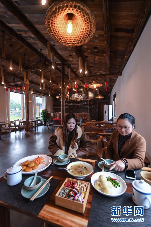 12月19日,章淑貞(左)在民宿“初憶小院”內(nèi)請一名客人品嘗自己做的點心。該民宿是河橋鎮(zhèn)“90后”女孩章淑貞開辦的,民宿融入了大量的現(xiàn)代建筑設計風格,深受年輕人的喜愛。 新華社記者 徐昱 攝