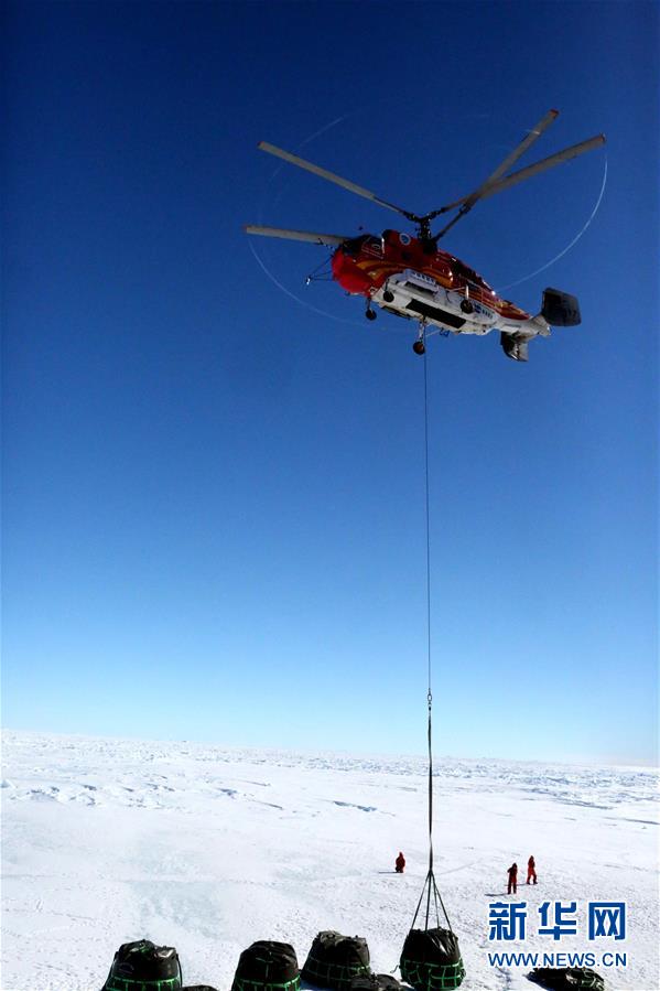 從11月30日開始,考察隊成功將1605噸物資由“雪龍”號運至南極中山站和內(nèi)陸考察出發(fā)基地,冰上運輸和直升機吊運分別為951噸和654噸。