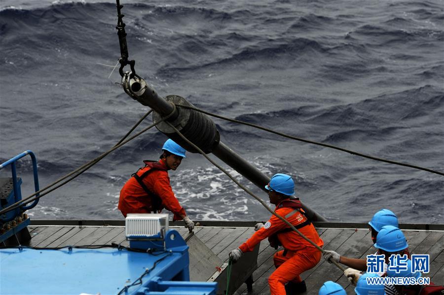 科考團隊成員林剛(左)、程淞(右)回收重力柱(12月20日攝)。