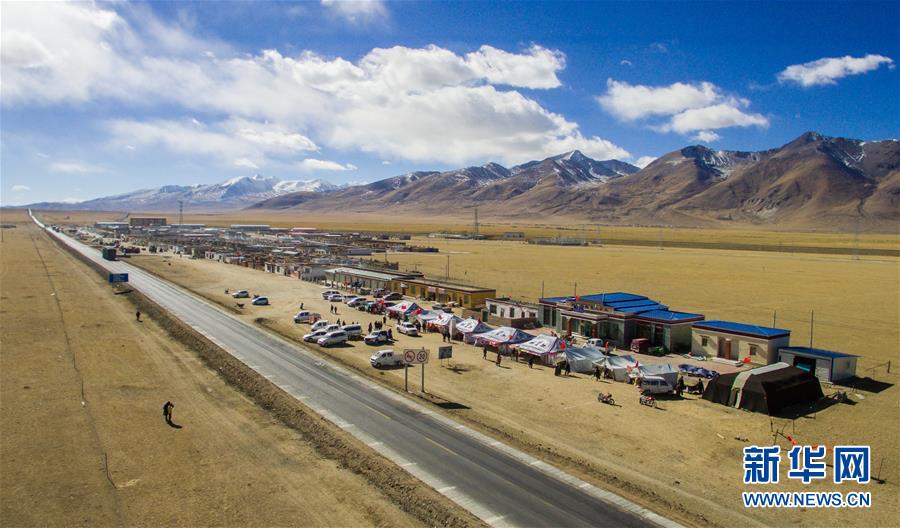 這是在青藏公路旁搭建的那曲縣香茂鄉(xiāng)畜產(chǎn)品展銷會(2017年11月25日無人機(jī)拍攝)。 新華社記者 劉東君 攝
