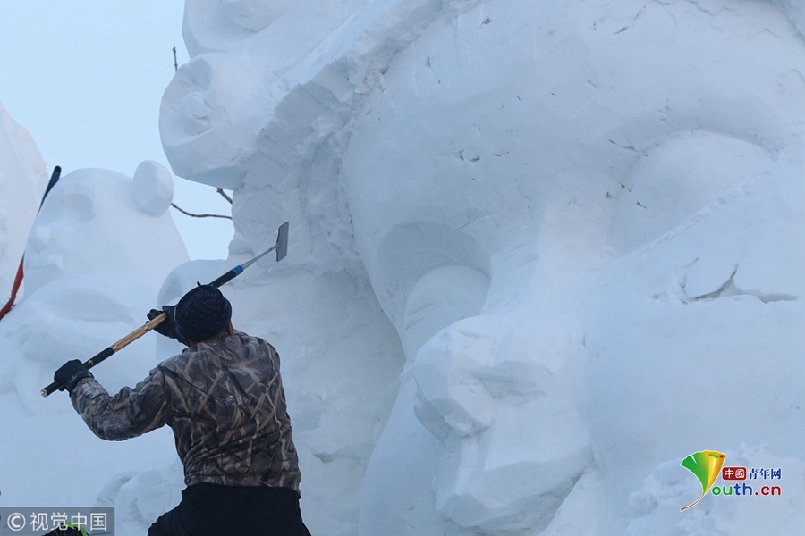 國內(nèi)最大的雪雕盛會太陽島雪博會正在緊鑼密鼓建設中,部分雪雕雛形已現(xiàn),雪雕師正在精雕細刻打磨中。