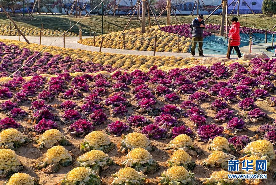 12月24日,游人在北京玉淵潭公園觀賞甘藍(lán)。 日前,北京市玉淵潭公園移栽的三萬多棵紫色和黃色羽衣甘藍(lán)盛開,為冬季公園增添了色彩。 新華社記者李欣攝