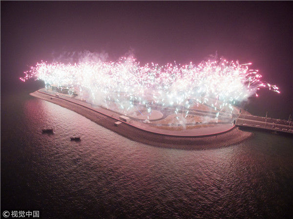 2017年12月31日,港珠澳大橋全線亮燈,標志著全線供電照明系統(tǒng)施工圓滿完成,意味著港珠澳大橋主體工程已經具備通車條件。亮燈儀式上,大橋東人工島四周燃放起壯麗的煙花。