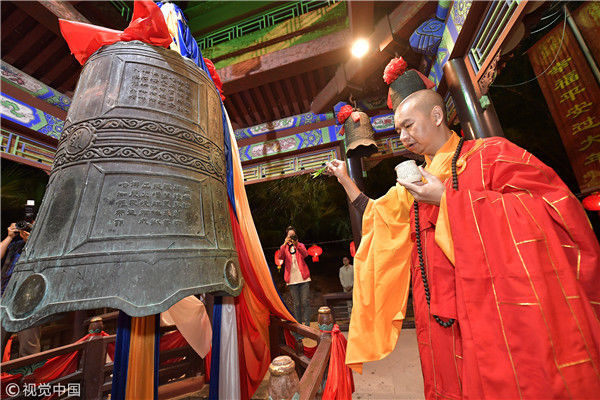2017年1月1日零時許,海南三亞南山舉行撞鐘祈福迎新系列民俗文化活動,南山寺僧眾和游客敲響108響吉祥鐘聲,祈福國泰民安,迎接2018年的到來。