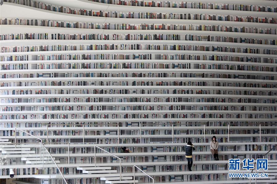 12月27日,讀者在天津?yàn)I海新區(qū)圖書館中庭的“書山”上拍照。 濱海新區(qū)圖書館位于天津?yàn)I海文化中心,2017年10月1日正式開館,設(shè)計(jì)立意為“濱海之眼”和“書山有路勤為徑”。圖書館現(xiàn)有藏書60多萬冊,一年多來接待讀者約280萬人次,已成為濱海新區(qū)的文化“新地標(biāo)”。 新華社記者伍婧丹攝