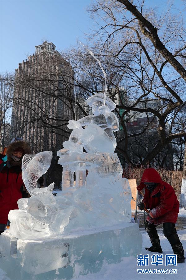 12月27日,選手們在比賽中完善冰雕作品。 當(dāng)日,第十六屆黑龍江省大學(xué)生冰雕藝術(shù)設(shè)計創(chuàng)作大賽在哈爾濱兆麟公園落下帷幕,全省高校共有99支隊伍參賽。 新華社記者曹霽陽攝