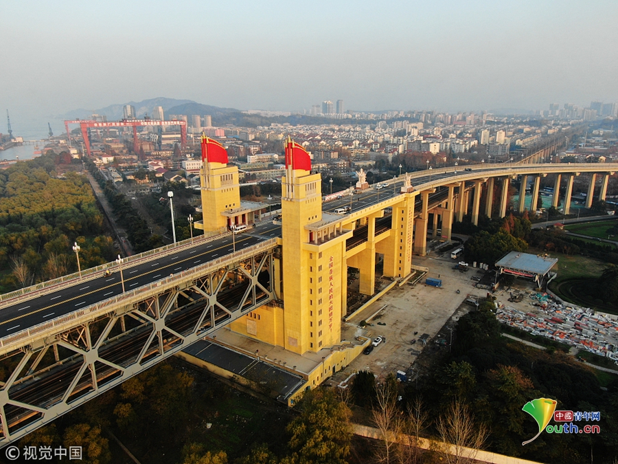 2017年9月19日,南京長江大橋正橋的混凝土面板已經(jīng)全部拆除,僅剩交錯(cuò)縱橫的鋼桁架橫跨在長江之上,從高空俯瞰猶如一條“鋼鐵巨龍”。