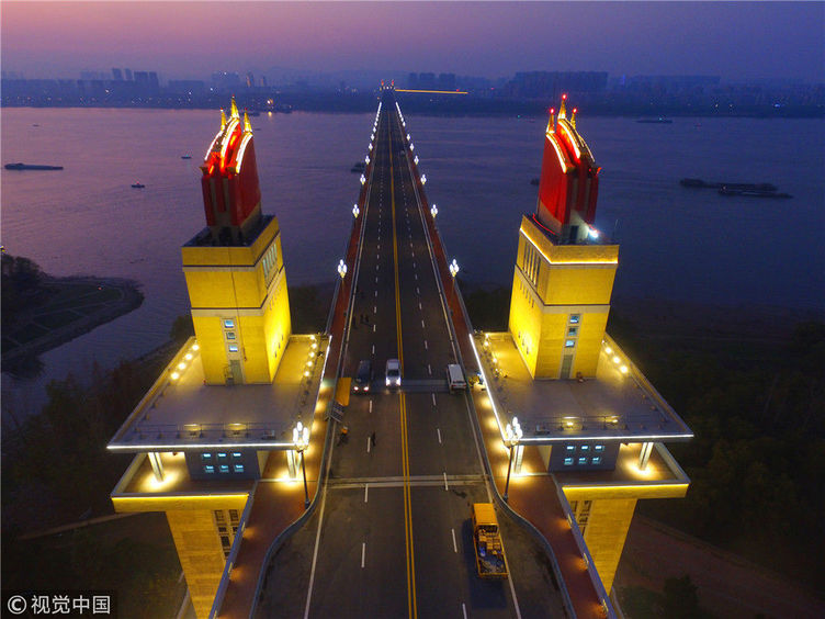 2016年10月28日晚,服役48年的南京長江大橋正式封閉,進(jìn)入合同工期長達(dá)27個(gè)月的改造提升期。身為我國橋梁建設(shè)領(lǐng)域的扛鼎之作,南京長江大橋的此次封閉改造牽涉到公路繁忙、鐵路風(fēng)險(xiǎn)、技術(shù)攻關(guān)、文物保護(hù)等諸多難點(diǎn),不僅影響面廣,而且社會(huì)關(guān)注度極高。如今,隨著整個(gè)工程進(jìn)入收尾階段,即將于2018年12月底正式通車。圖為2018年12月13日,夜幕降臨,南京長江大橋歸位后的玉蘭花燈重新點(diǎn)亮。大橋玉蘭花燈柱共有299根,每根燈柱上有5盞玉蘭花燈,1大4小,一共1495盞。