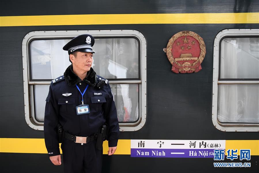 1月1日,在廣西南寧火車站,楊鐵鳴在剛剛從越南河內(nèi)(嘉林)開來(lái)的列車旁值勤。楊鐵鳴是第一趟中越國(guó)際客運(yùn)列車的當(dāng)班乘警,現(xiàn)在依然在這趟列車上值守。 新華社記者陸波岸攝