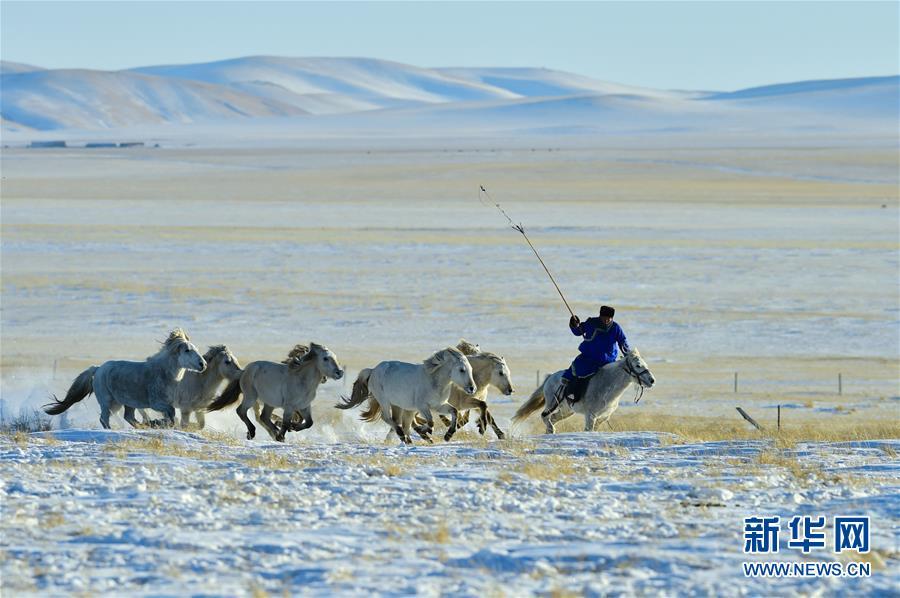 1月8日,牧民進(jìn)行套馬表演。 時(shí)下正值草原冬季旅游旺季,內(nèi)蒙古自治區(qū)西烏珠穆沁旗的牧民們在雪原上一展身手,為游客展現(xiàn)獨(dú)特的民族風(fēng)情。 新華社記者 鄒予 攝
