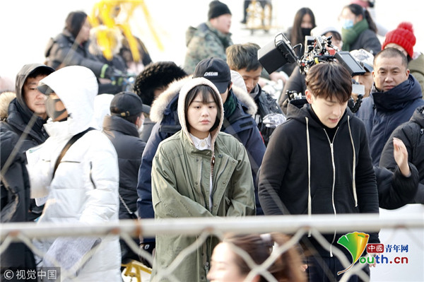 2019年1月9日,北京,鄧倫、馬思純現(xiàn)身后?;鶊?,騎冰車拍攝新劇《加油你是最棒的》。寒冷的北京,二人身著單薄的劇中服裝現(xiàn)身拍攝片場,不顧嚴寒超敬業(yè)。