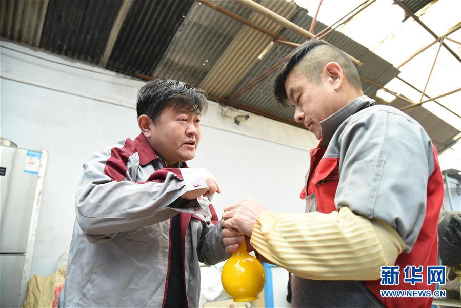 1月12日,孫云毅(左)在和工人交流一只雞油黃琉璃藝術品的打磨工藝。 新華社記者王凱攝