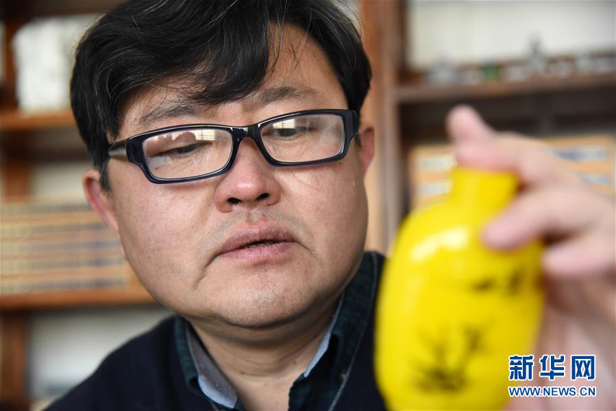 1月12日,孫云毅在查看一只剛剛畫完的雞油黃鼻煙壺。 新華社記者王凱攝