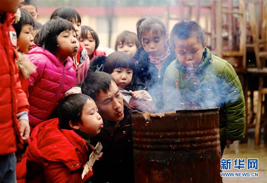 1月3日,章站亮(前右)和黃泥小學(xué)的學(xué)生們一起生火。由于生火用的材料均是廢棄的桌椅或者枯葉,點火后得不停地靠嘴吹氣才能燒得旺盛。