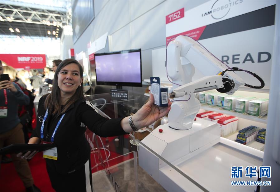 1月14日,在美國紐約舉行的全國零售商聯(lián)合會年度大會的“創(chuàng)新實驗室”展廳,工作人員從自動取貨機器人“手中”取下貨品。 美國全國零售商聯(lián)合會年度大會于1月13日至15日在紐約舉行,許多來自世界各地的展商帶來使用新技術開發(fā)出的軟硬件產品,向觀眾展示未來零售業(yè)的新愿景。 新華社記者 王迎 攝