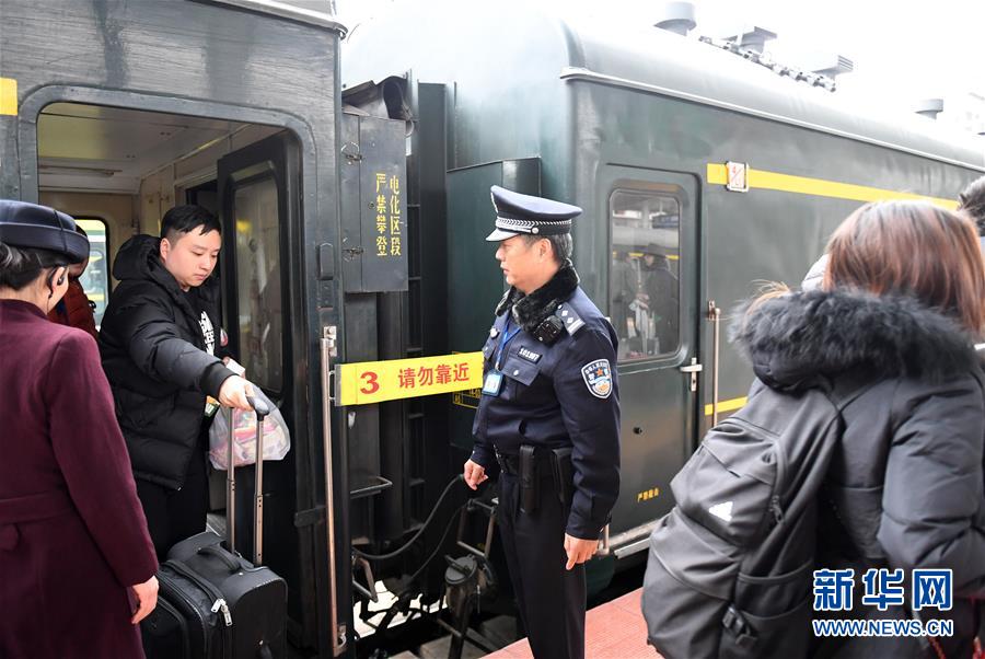 1月1日,在廣西南寧火車站,乘警楊鐵鳴在從越南河內(nèi)(嘉林)開往中國(guó)南寧列車旁值勤。 新華社記者陸波岸攝
