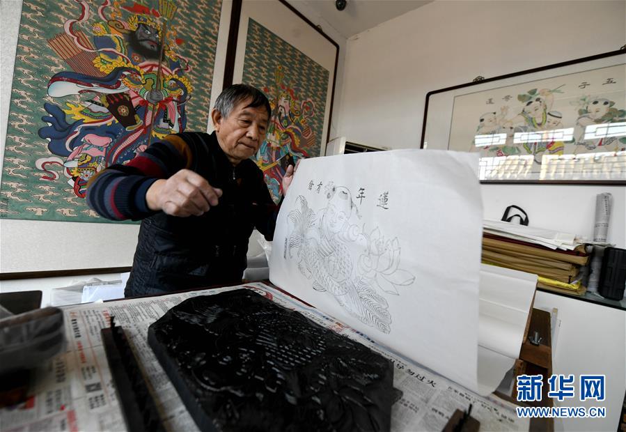 1月16日,霍慶順在套印年畫(huà)《連年有余》。