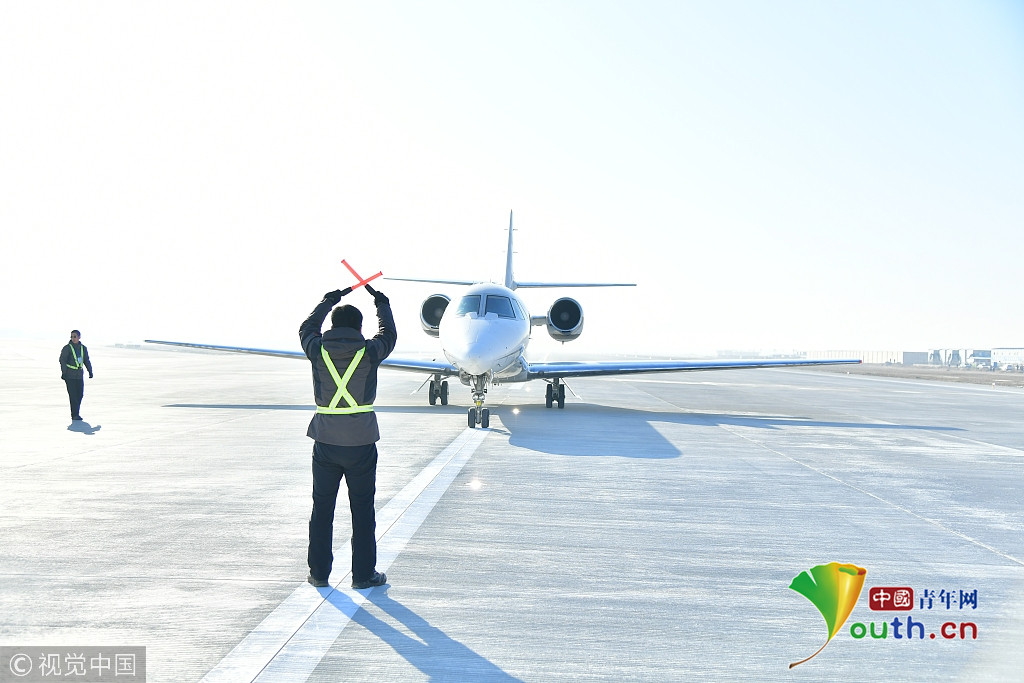 2019年1月22日,北京,一架獎(jiǎng)狀680校驗(yàn)飛機(jī)平穩(wěn)地降落在北京大興國(guó)際機(jī)場(chǎng)西一跑道上,留下了第一道飛機(jī)輪胎印跡,這意味著大興國(guó)際機(jī)場(chǎng)第一場(chǎng)校驗(yàn)任務(wù)圓滿完成。視覺中國(guó)