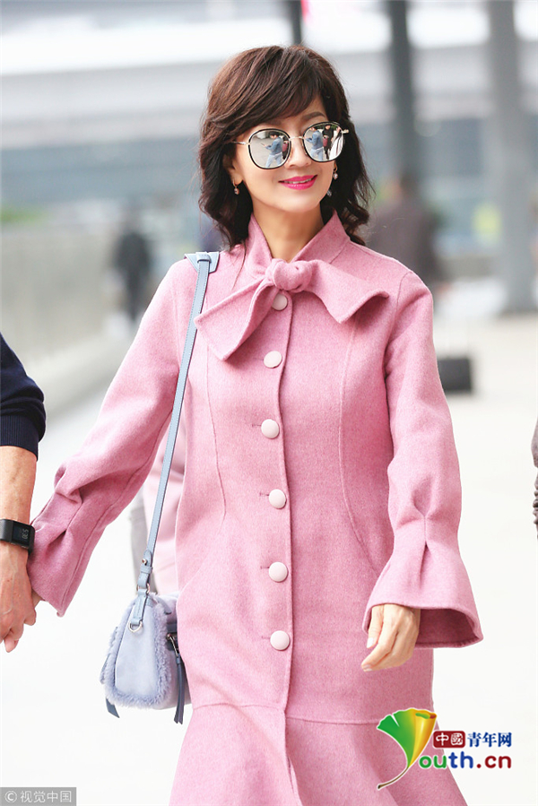 1月22日,廣東深圳,近日,趙雅芝與丈夫黃錦燊現(xiàn)身機(jī)場(chǎng),黑超遮面的她身著粉色昵子魚尾大衣,氣質(zhì)超群,一路獲粉絲跟隨,共先生黃錦燊牽手同行。