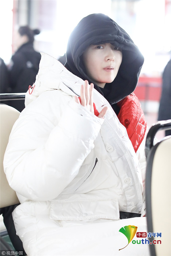 1月23日,北京,周冬雨現(xiàn)身機(jī)場(chǎng)。她用黑色連衣帽罩頭襯托巴掌臉,把下巴擱在行李車(chē)推桿上的雙手上呆萌可愛(ài) 。