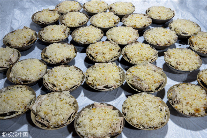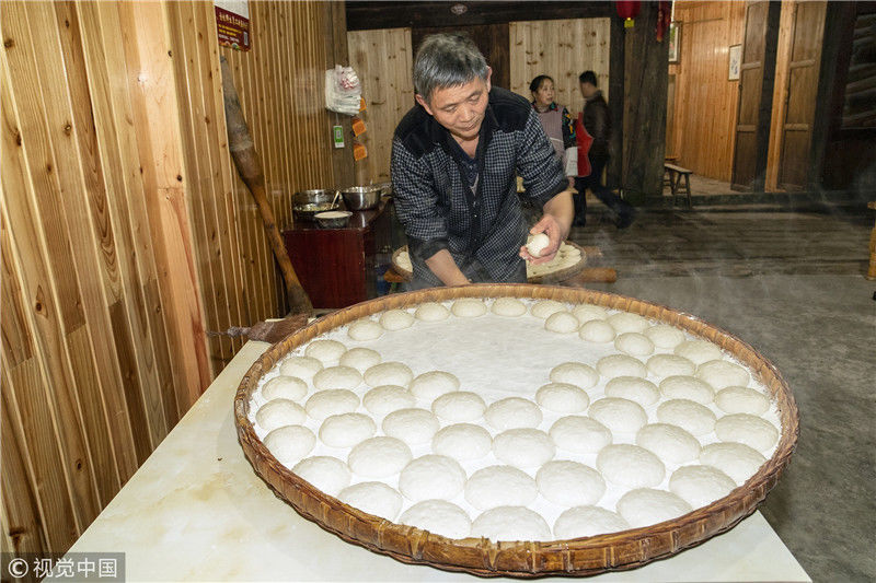 2019年1月26日,重慶中山古鎮(zhèn),880桌“千米長宴”5萬人共品年味。街坊們?cè)陬^天就開始準(zhǔn)備各種菜肴與小吃。