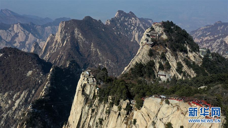 3月9日,游人在華山南峰游覽(無人機(jī)拍攝)。 隨著氣溫回升,陜西著名風(fēng)景區(qū)華山進(jìn)入旅游旺季。 新華社記者 陶明 攝