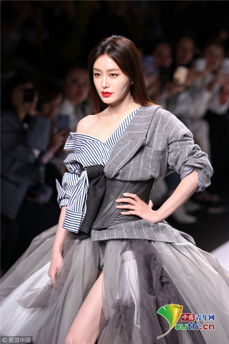2019年3月31日,上海,2019上海秋冬時裝周,秦嵐助陣古巨基自創(chuàng)品牌大秀。她穿西裝紗紗裙笑容滿面可鹽可甜,斜肩小西裝正好能露出天鵝頸的線條,性感又不失知性?!拔灏⒏纭惫啪藁鶆t穿著隨性,與“知畫”牽手走秀,引起滿滿“回憶殺”。