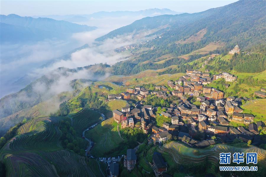 龍勝各族自治縣和平鄉(xiāng)平安村一景(4月7日無人機(jī)拍攝)。連日降雨過后,廣西龍勝各族自治縣和平鄉(xiāng)平安村的壯族村寨迎來久違的朝陽。 新華社記者 曹祎銘 攝