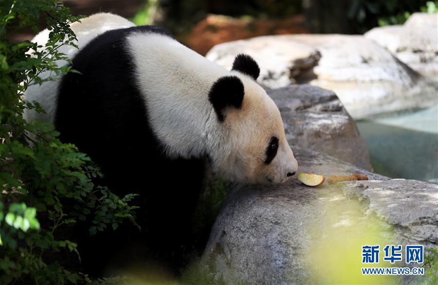4月6日,在美國圣迭戈動(dòng)物園熊貓館,大熊貓“白云”在覓食。新華社記者李穎攝