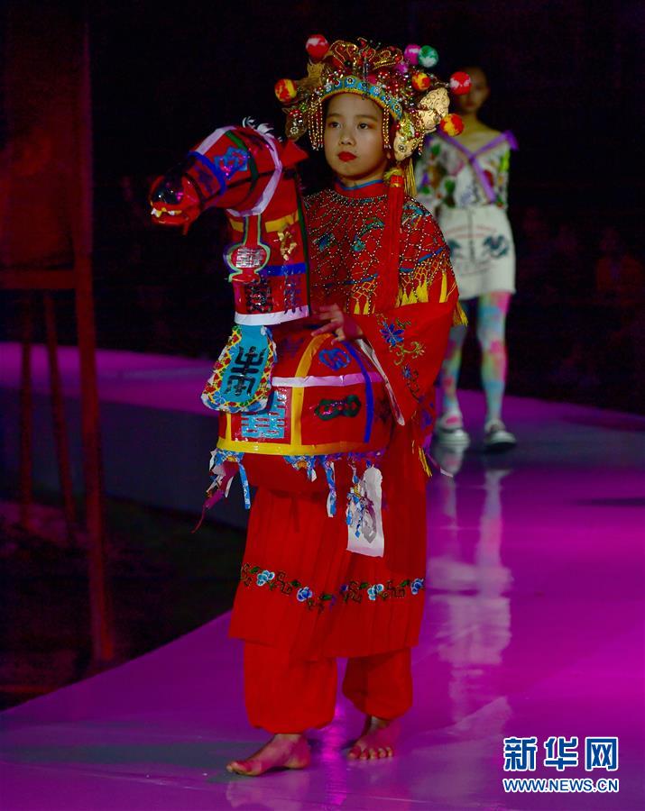 4月27日,小模特身穿民族服飾展示土樓當?shù)氐姆俏镔|文化遺產(chǎn)竹馬戲。 當日,土樓光語國際時尚大秀在福建省南靖縣的土樓裕昌樓內舉行。這場融匯文化、時尚與旅游元素的大秀,通過傳統(tǒng)與時尚的有機融合,展現(xiàn)南靖土樓及文化的魅力和風采。 新華社記者魏培全攝