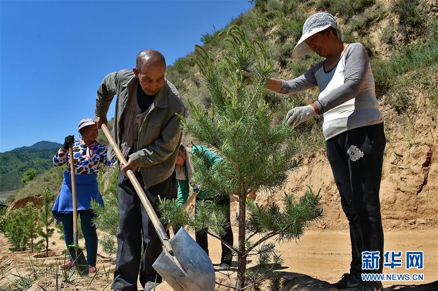 2017年5月26日,嵐縣會里村村民在呂梁山上種樹。新華社記者 曹陽 攝