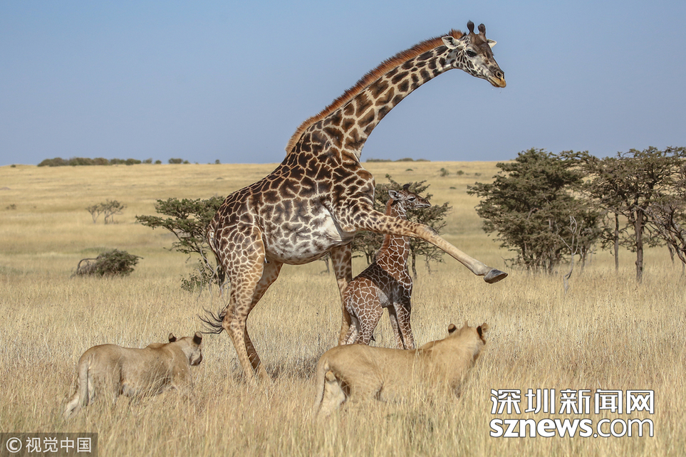 深圳新聞網(wǎng)訊 當(dāng)?shù)貢r(shí)間2018年8月15日,肯尼亞馬賽馬拉,當(dāng)?shù)貙?dǎo)游詹姆斯·納帕索(James Nampaso)拍攝到一群獅子圍攻母長(zhǎng)頸鹿和她的幼崽。盡管長(zhǎng)頸鹿勇敢地抵抗獅群的進(jìn)攻,但當(dāng)一頭母獅跳上它的脊背時(shí),它被分散了注意力,使得獅群最終捕獲了它的孩子。