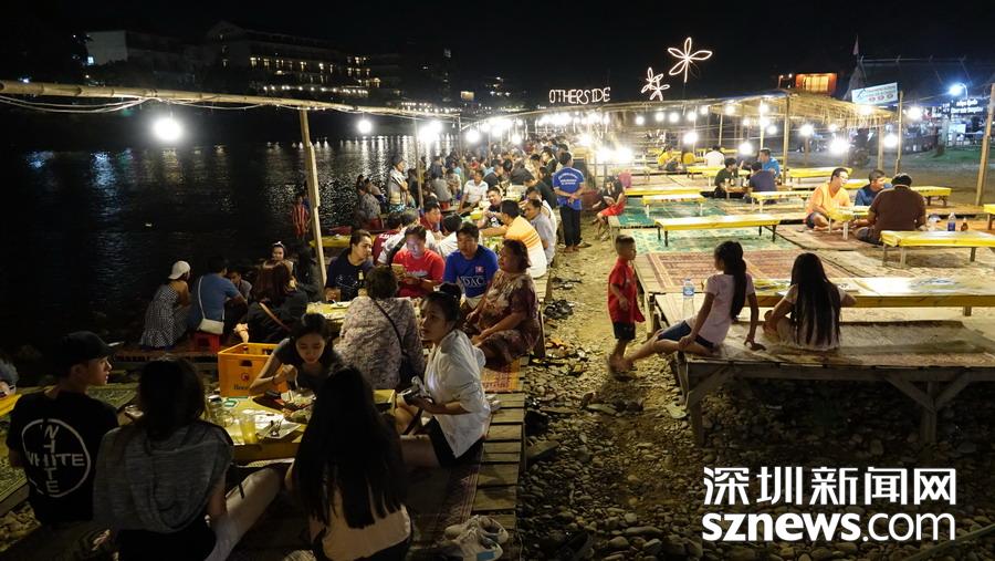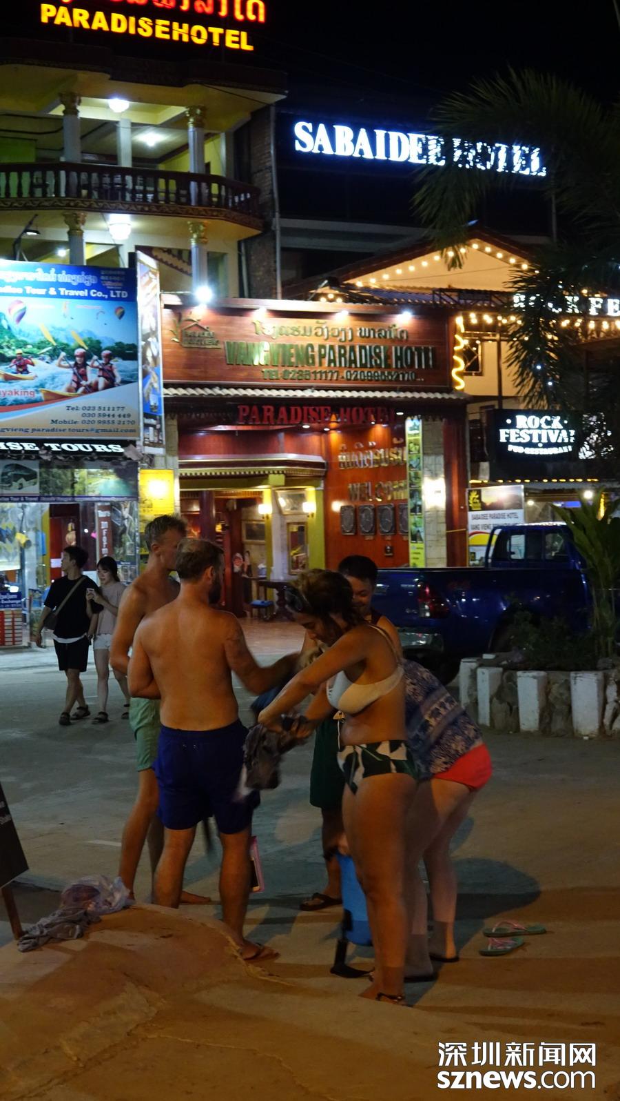 萬榮的開放程度很高。夜晚,南松河畔、街道兩旁都是酒吧,常??梢钥吹狡骰貋砩碇狙b的“老外”當(dāng)街站立。李仁奇   攝