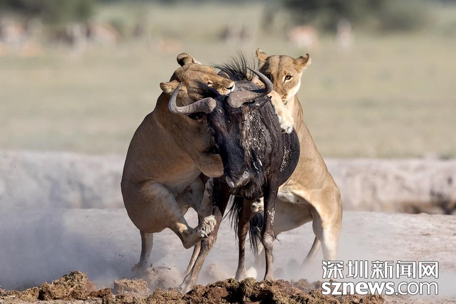 英國攝影師蘇-莫里斯(Sue Morri)在博茨瓦納Nxai Pan國家公園游玩,目睹了一場兇惡母獅獵食角馬的畫面。母獅甚至攀到了角馬背上,想要牢牢遏制住到手的“美餐”。強壯的角馬努力地與母獅抗爭,竭力想要保住自己的性命,但最終還是不敵母獅被拿下,最后成了母獅孩子們的盤中餐。