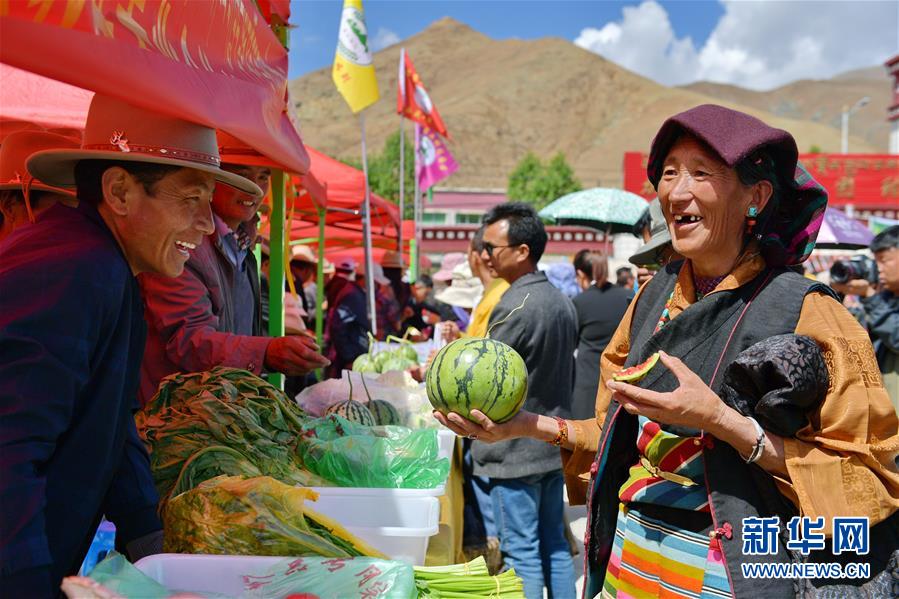 5月28日,當(dāng)?shù)剞r(nóng)牧民在白朗縣豐登廣場(chǎng)品嘗西瓜。 近日,西藏日喀則市白朗縣1.46萬(wàn)畝瓜果蔬菜喜獲豐收。百姓們?cè)诳h里的豐登廣場(chǎng)載歌載舞,慶祝白朗縣第九屆果蔬采摘節(jié)。 新華社記者 張汝鋒 攝