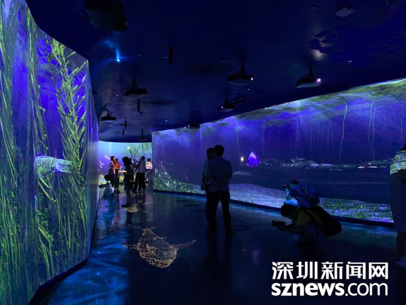 一進(jìn)館,潛入深海的氣息撲面而來,海底生物在身邊若隱若現(xiàn),海底卷起細(xì)小的漩渦,遠(yuǎn)處,神秘的海魚跟你打個(gè)照面,轉(zhuǎn)身離開,海底生物和海浪的聲音環(huán)繞耳旁,逼真的特效、巧妙的互動(dòng)機(jī)制讓人身臨其境,猶如穿越到藍(lán)色大海里,與魚兒作伴,與水母交友,令人沉醉于亦夢亦真的海底世界。