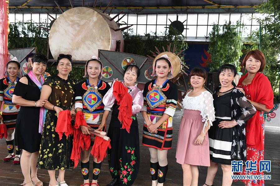 游客與基諾族大鼓舞演員合影(6月1日攝)。 在云南省西雙版納傣族自治州景洪市基諾山基諾族鄉(xiāng)的基諾族村寨,每天的基諾大鼓舞表演吸引了眾多游客前來(lái)觀賞體驗(yàn),帶動(dòng)了基諾族群眾就業(yè)和增收。基諾族大鼓舞蘊(yùn)涵豐富的歷史文化內(nèi)涵,已被列入國(guó)家級(jí)非物質(zhì)文化遺產(chǎn)保護(hù)名錄。 新華社記者 楊宗友 攝