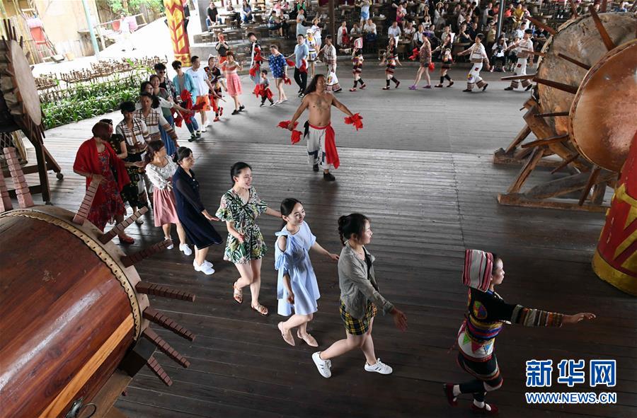 游客與基諾族大鼓舞演員一起跳舞(6月1日攝)。 在云南省西雙版納傣族自治州景洪市基諾山基諾族鄉(xiāng)的基諾族村寨,每天的基諾大鼓舞表演吸引了眾多游客前來觀賞體驗,帶動了基諾族群眾就業(yè)和增收?;Z族大鼓舞蘊涵豐富的歷史文化內(nèi)涵,已被列入國家級非物質(zhì)文化遺產(chǎn)保護名錄。 新華社記者 楊宗友 攝