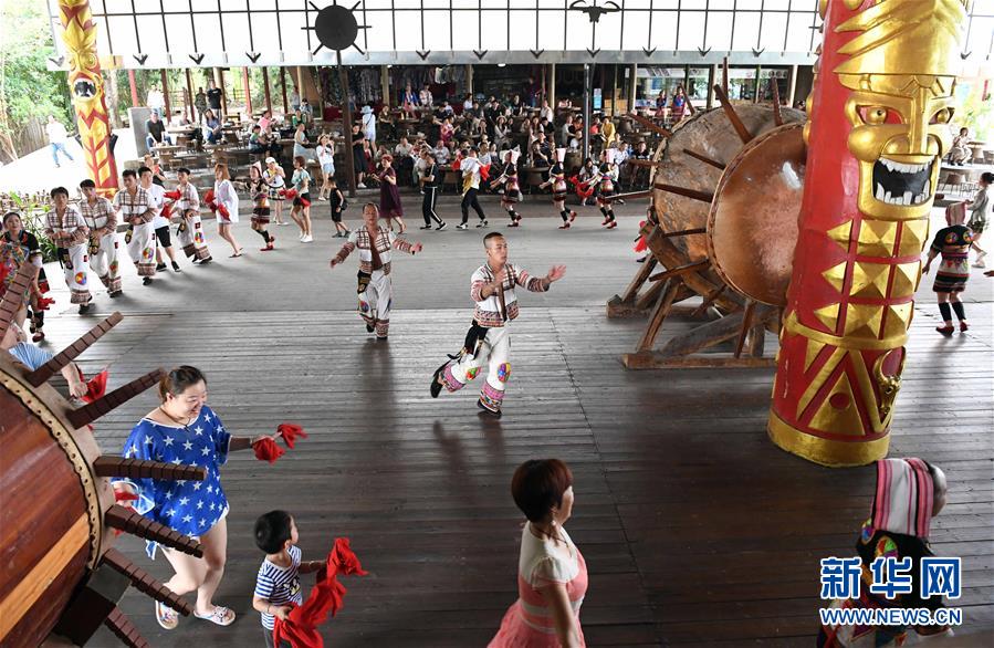 游客與基諾族大鼓舞演員一起跳舞(6月1日攝)。 在云南省西雙版納傣族自治州景洪市基諾山基諾族鄉(xiāng)的基諾族村寨,每天的基諾大鼓舞表演吸引了眾多游客前來(lái)觀賞體驗(yàn),帶動(dòng)了基諾族群眾就業(yè)和增收?;Z族大鼓舞蘊(yùn)涵豐富的歷史文化內(nèi)涵,已被列入國(guó)家級(jí)非物質(zhì)文化遺產(chǎn)保護(hù)名錄。 新華社記者 楊宗友 攝