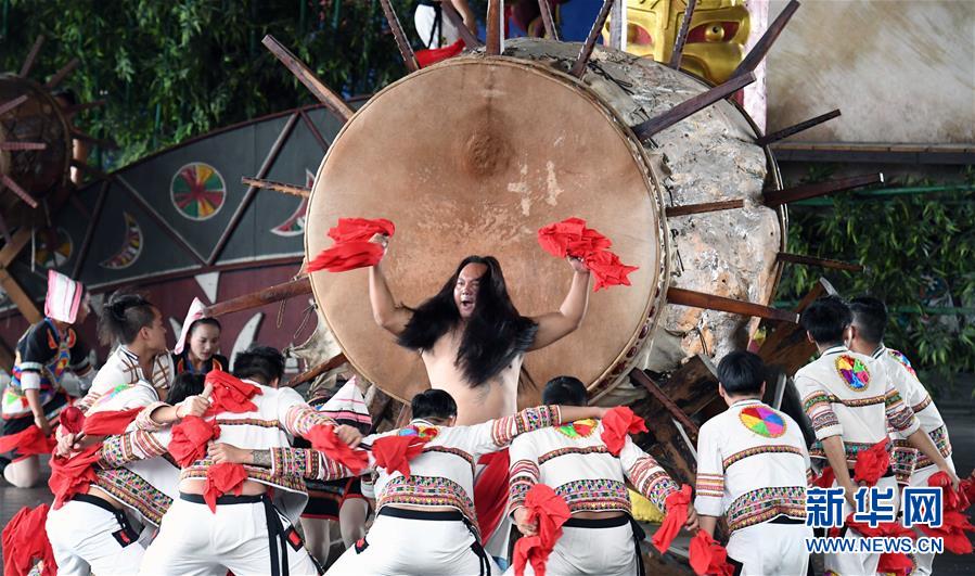 基諾族演員在表演大鼓舞(6月1日攝)。 在云南省西雙版納傣族自治州景洪市基諾山基諾族鄉(xiāng)的基諾族村寨,每天的基諾大鼓舞表演吸引了眾多游客前來觀賞體驗(yàn),帶動了基諾族群眾就業(yè)和增收?;Z族大鼓舞蘊(yùn)涵豐富的歷史文化內(nèi)涵,已被列入國家級非物質(zhì)文化遺產(chǎn)保護(hù)名錄。 新華社記者 楊宗友 攝