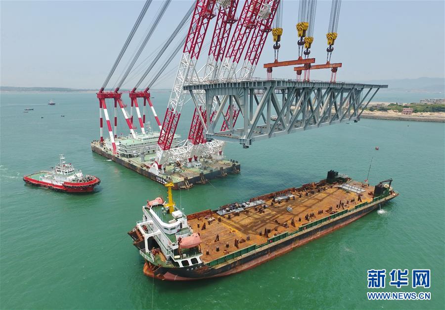 5月12日,“大橋海鷗號(hào)”起重船在吊裝一孔簡(jiǎn)支鋼桁梁(無(wú)人機(jī)拍攝)。新華社記者 林善傳 攝