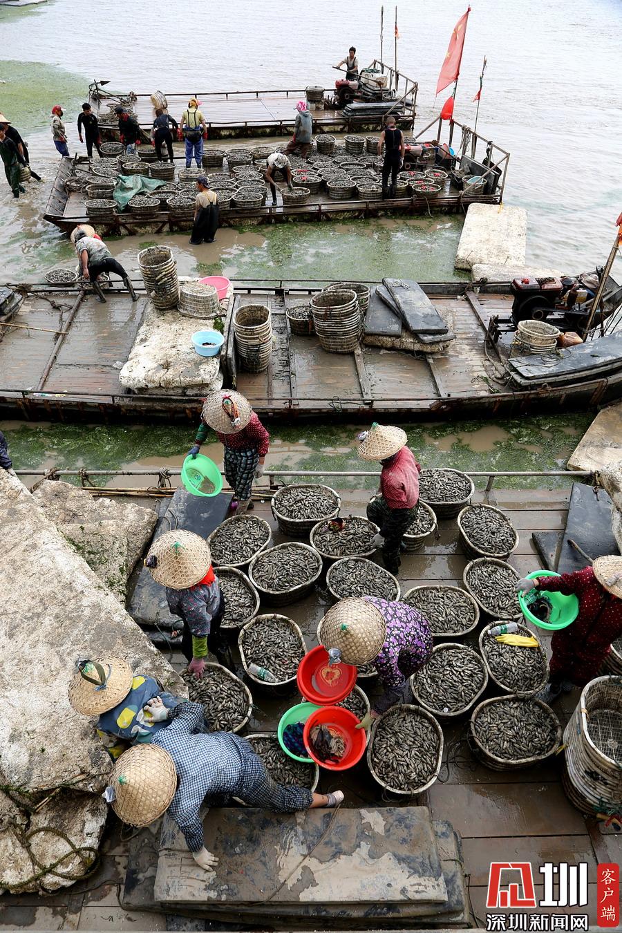 村民們冒雨和商販交易蟶苗,現(xiàn)場一片繁忙。