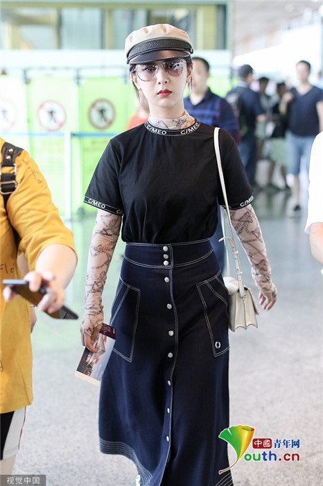 2019年7月25日,北京,楊紫現(xiàn)身機(jī)場。她穿黑色短T配牛仔裙變時髦女郎,戴報(bào)童帽架墨鏡”港風(fēng)女sir“即視感,人氣爆棚。