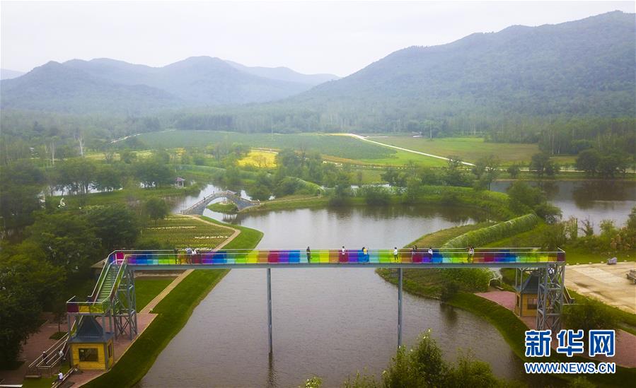 8月8日,游客在伊春市九峰山養(yǎng)心谷景區(qū)玻璃棧橋上行走(無人機(jī)拍攝)。 時(shí)值八月,黑龍江省伊春市林區(qū)空氣清新,涼爽宜人,吸引眾多游客。 新華社記者李曉果攝