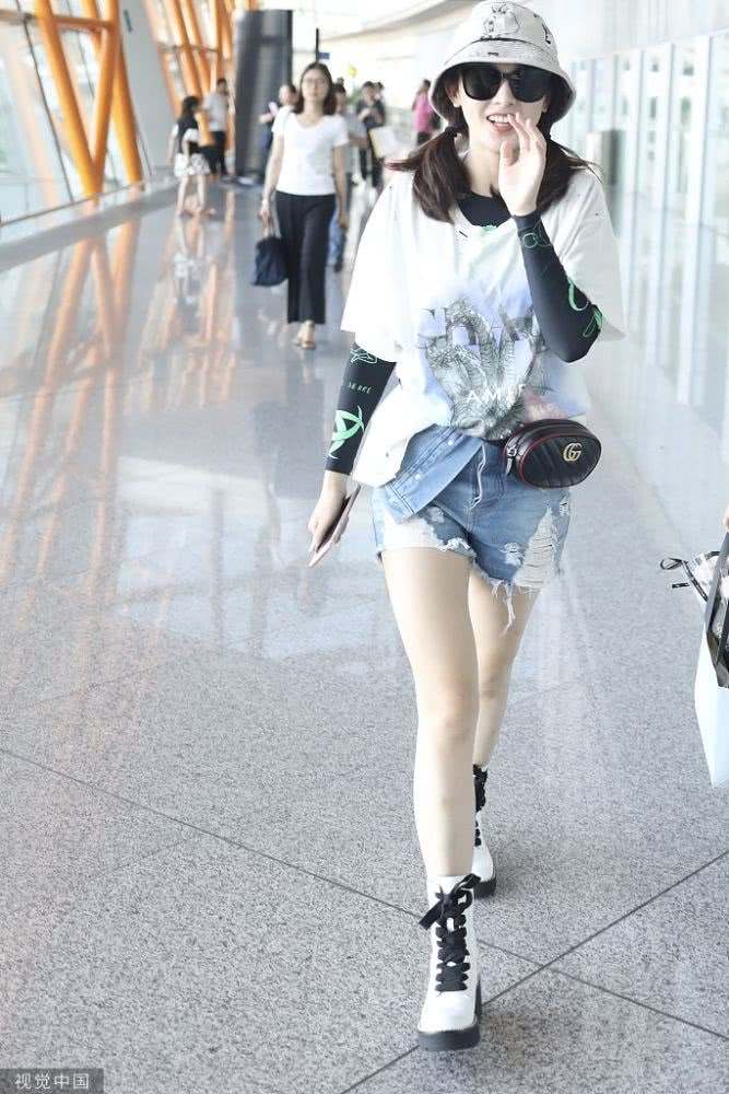 內(nèi)地女星彭小苒現(xiàn)身機(jī)場(chǎng),穿印花T恤牛仔短褲,白色馬丁靴很時(shí)髦