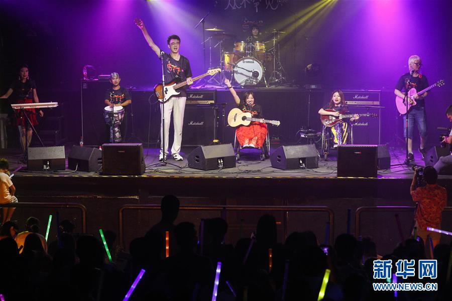 8月14日,8772樂隊(duì)發(fā)起人、隊(duì)長(zhǎng)王奕鷗(中)和樂隊(duì)成員崔瑩(左)、程利婷在演唱會(huì)上表演。新華社記者張玉薇攝