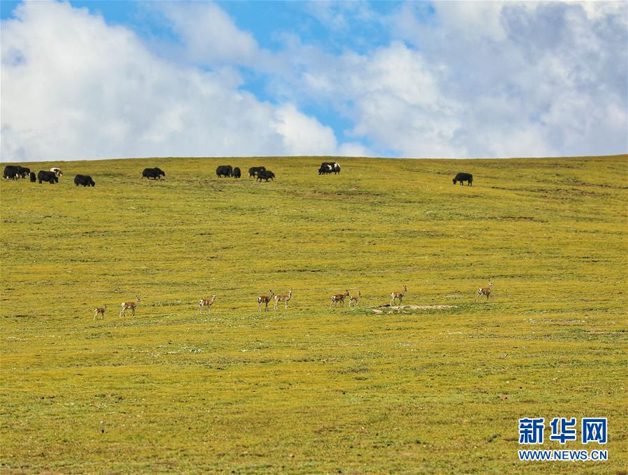 一群藏原羚在牦牛群旁駐足吃草(8月14日攝)。 8月12日至14日,來(lái)自全國(guó)各地的31名自然愛(ài)好者聚集在海拔4200米的青海省玉樹(shù)藏族自治州稱(chēng)多縣嘉塘草原,參加“2019嘉塘自然觀察節(jié)”。自然愛(ài)好者用獨(dú)特視角記錄珍稀野生動(dòng)植物,觀察三江源生態(tài)。 新華社記者 田文杰 攝