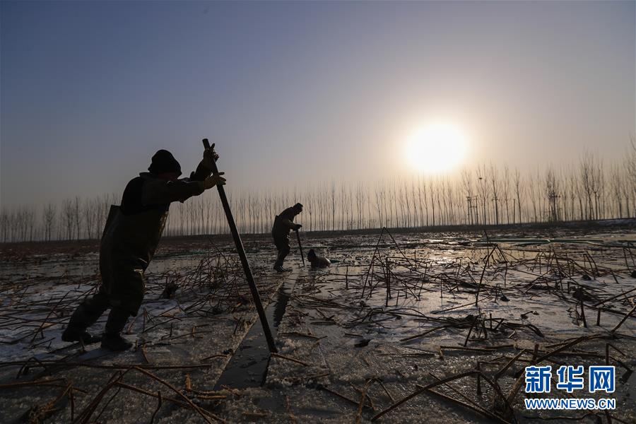寒冬時節(jié),白洋淀里依然活躍著不少挖藕人,他們身穿橡膠工作服,在冰冷的水中辛勤工作。