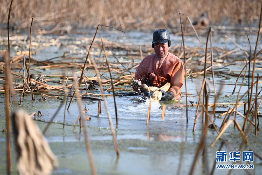 來自淮南的挖藕人王公平在肥西縣豐樂鎮(zhèn)一蓮藕種植基地收獲蓮藕。新華社記者劉軍喜攝