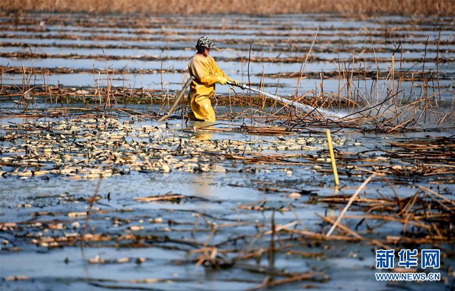 來自淮南的挖藕人張作志在肥西縣豐樂鎮(zhèn)一蓮藕種植基地用高壓水槍沖掉冰層。新華社記者劉軍喜攝